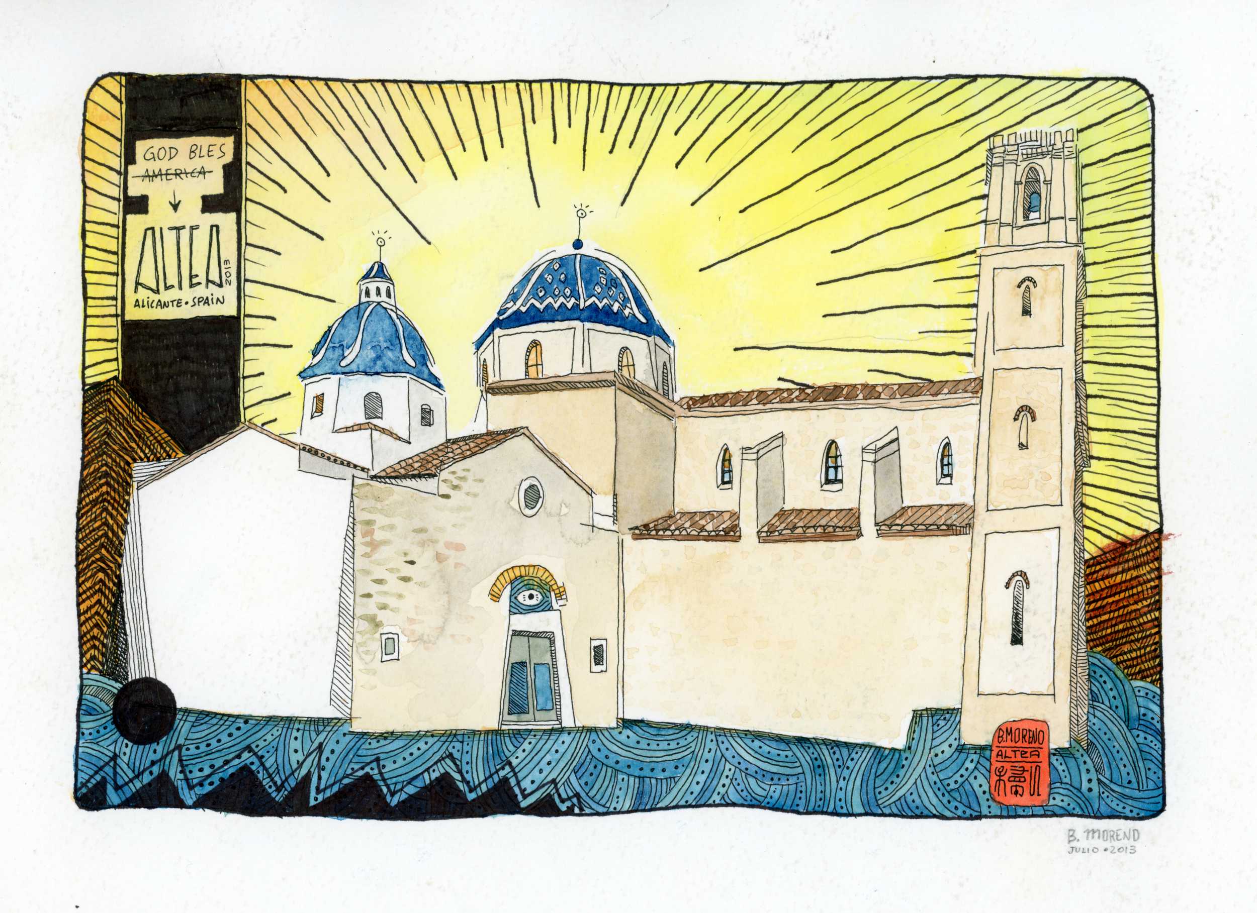 A «quirky» watercolor of the Altea church. Year 2013 signed with my name.