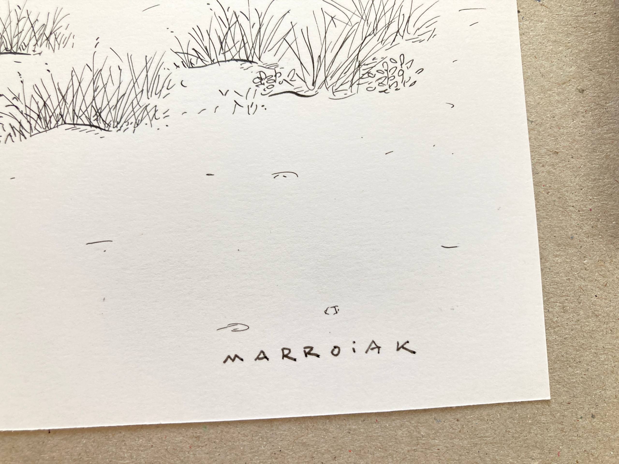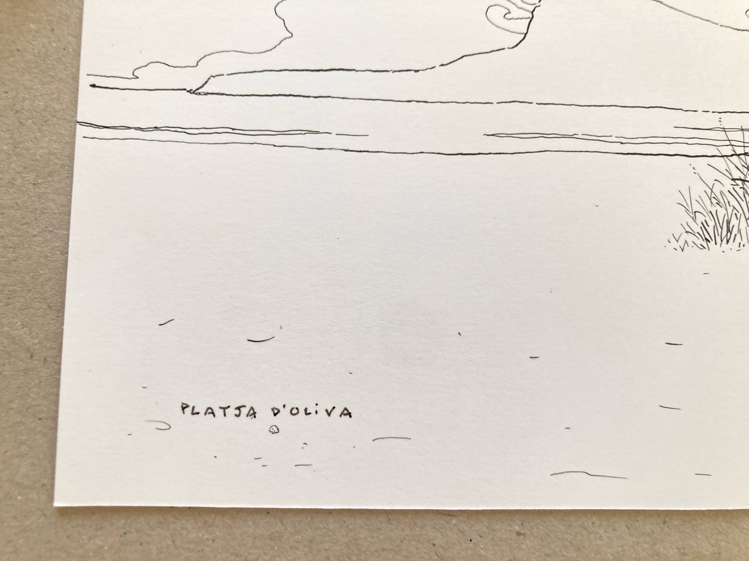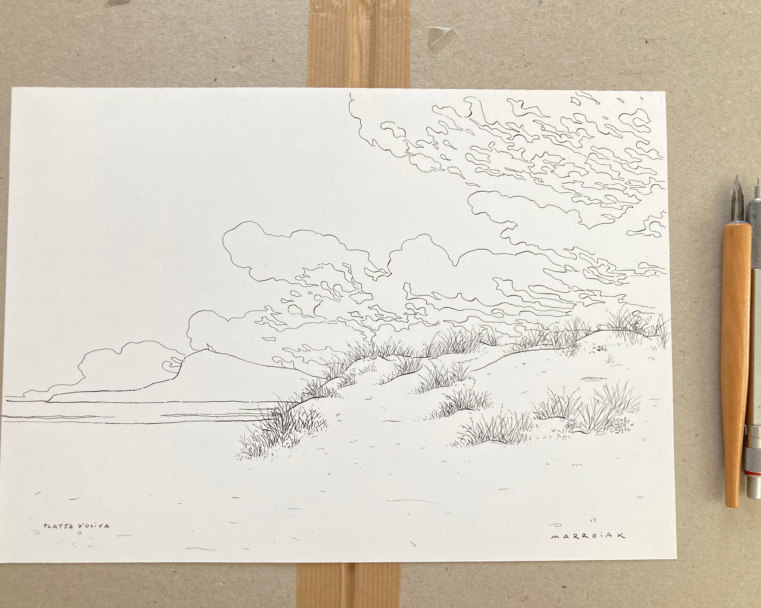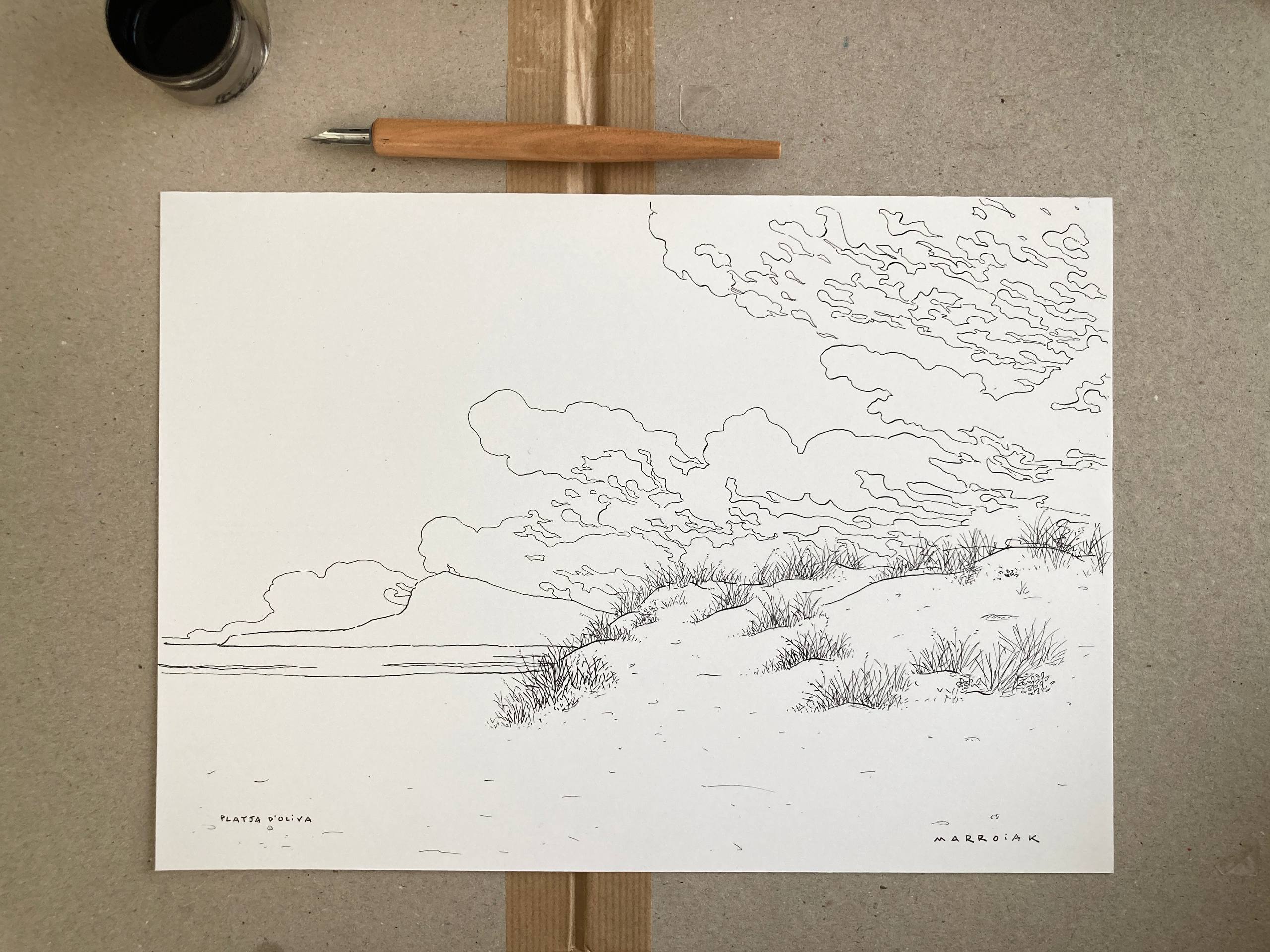 Un dibujo en blanco y negro de la Playa de Oliva con vistas al mágica y enigmática montaña del Montgó. Pieza realizada con plumilla y tinta sobre papel. Puede que haya más versiones de esta pieza como esta de here