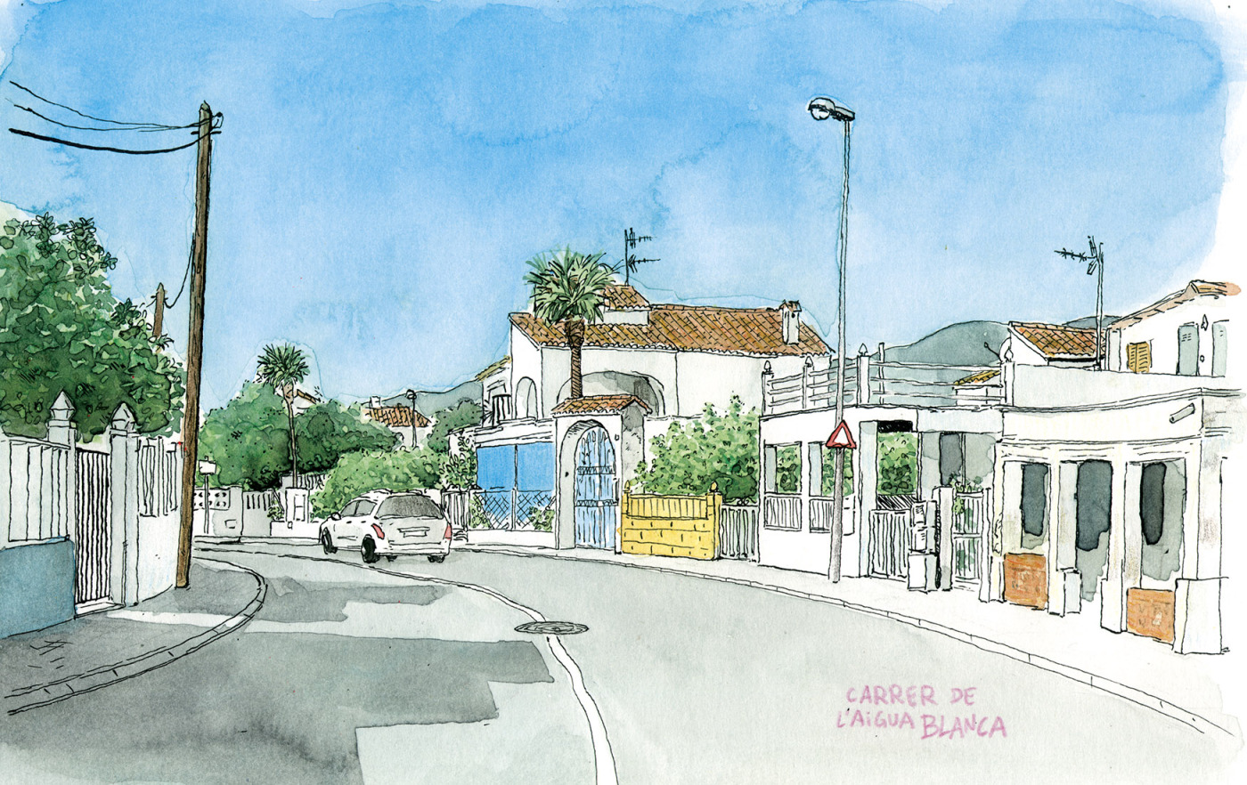 Print with a drawing of the carrer Aigüa Blanca on the beach of Oliva (Valencia). Illustration originally made in watercolor and ink on paper.