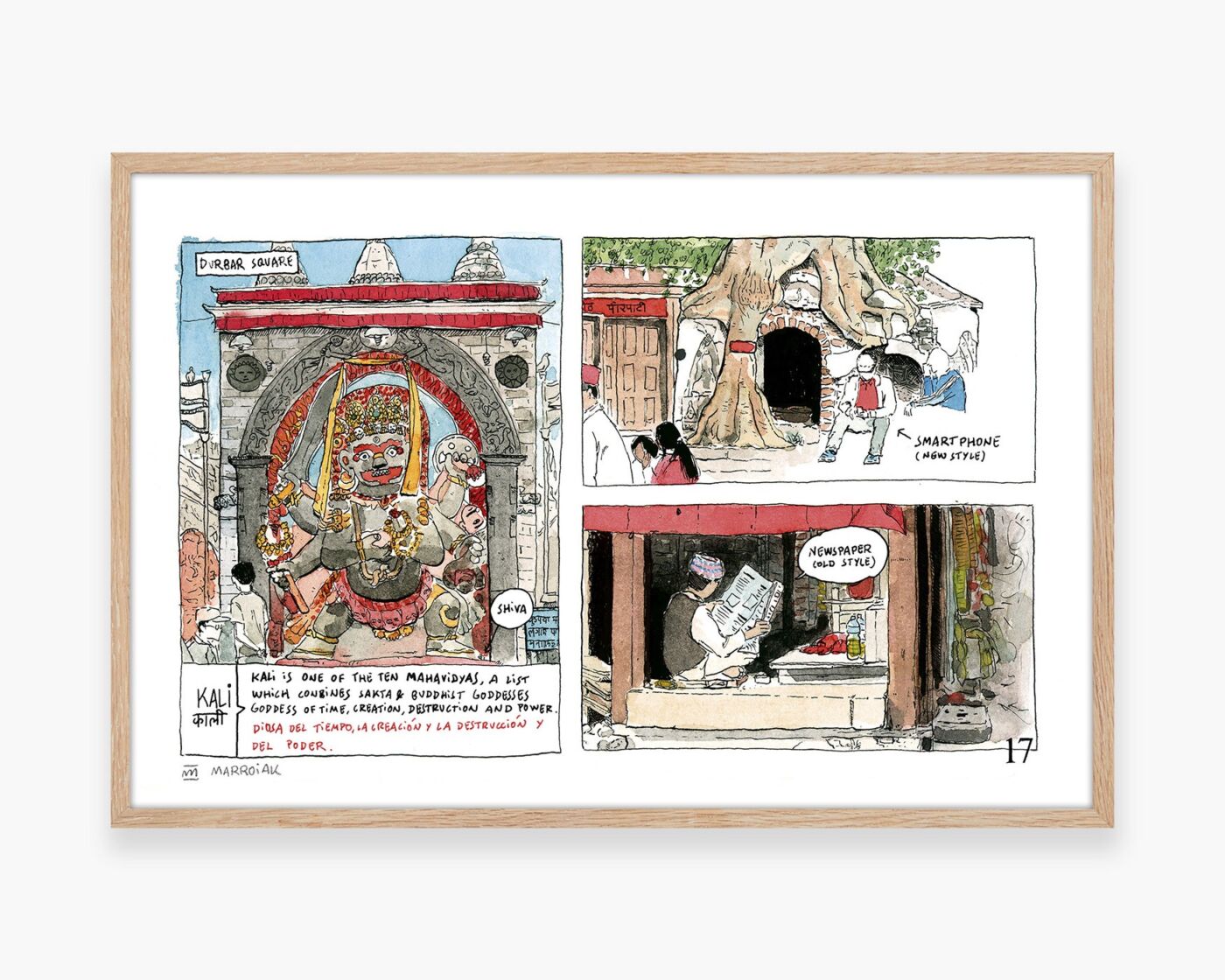 Print with an illustration of Goddess Kali and other everyday scenes in Durbar Square in Kathmandu, capital of Nepal.
