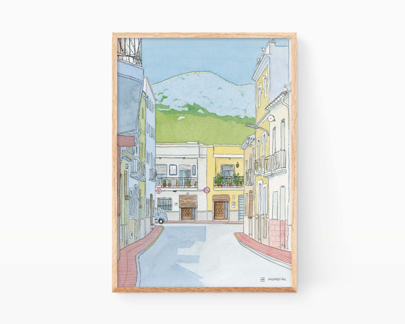 Handmade print signed with an illustration of the village of Xeresa in the region of La Safor, Valencia. Drawing originally made in ink and watercolor on paper.
