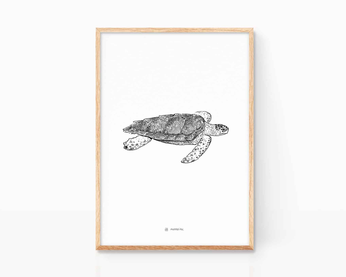 Handmade signed print with an illustration of a loggerhead turtle (Caretta Caretta). Black and white drawing made with ink on paper. Print for framing. See more animal plates.