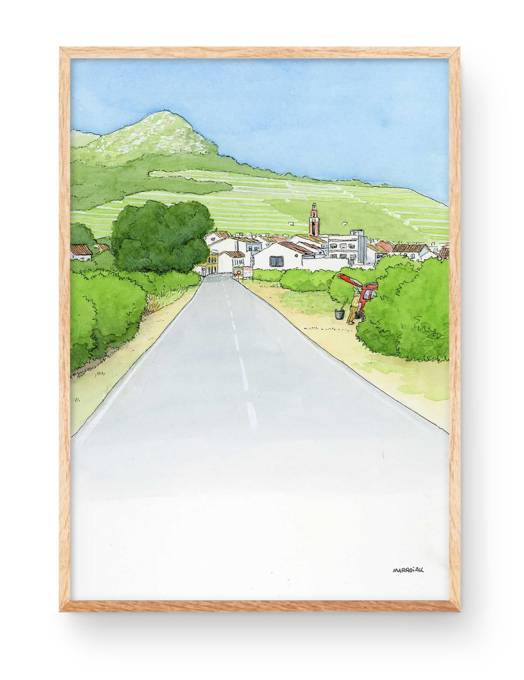 Handmade print signed with an illustration of the entrance to the village of Llocnou de Sant Jeroni, La Safor, Valencia. Drawing originally made in ink and watercolor on paper.