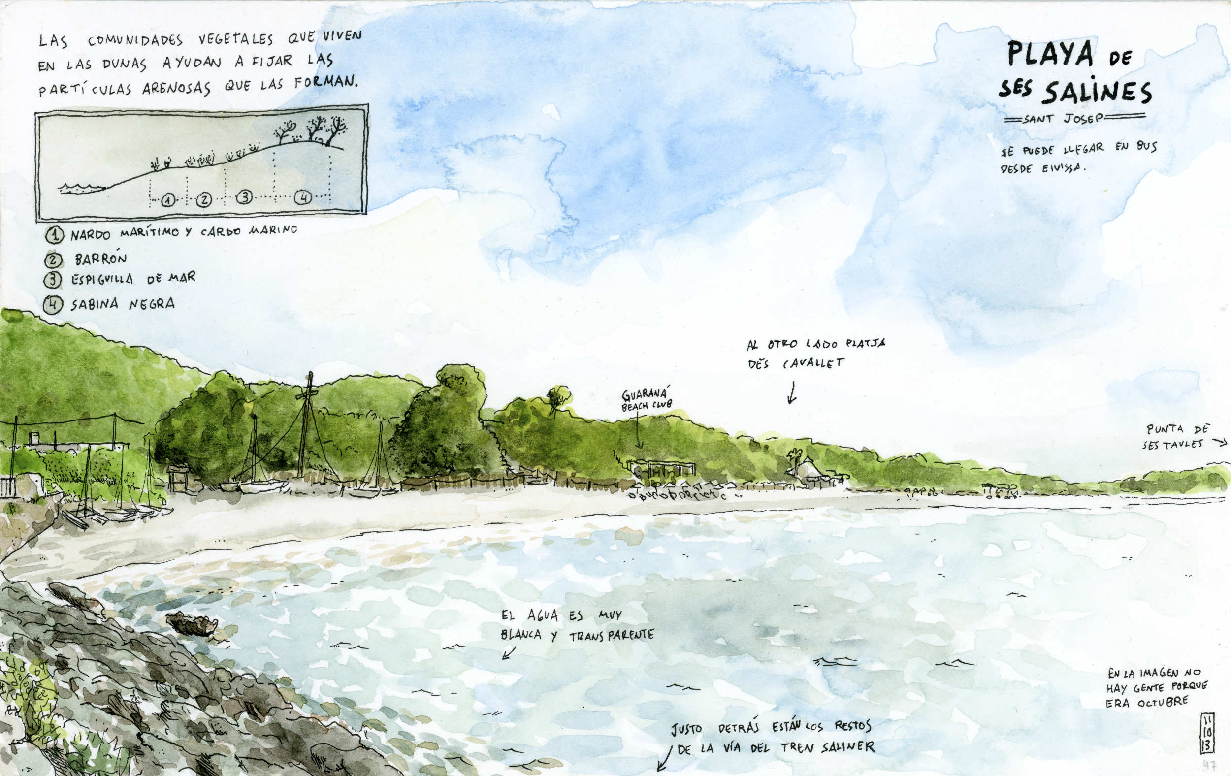 Original work in watercolor on paper made from life in the Platja de Ses Salines in Ibiza. It was used to illustrate the travel notebook IBIZA!