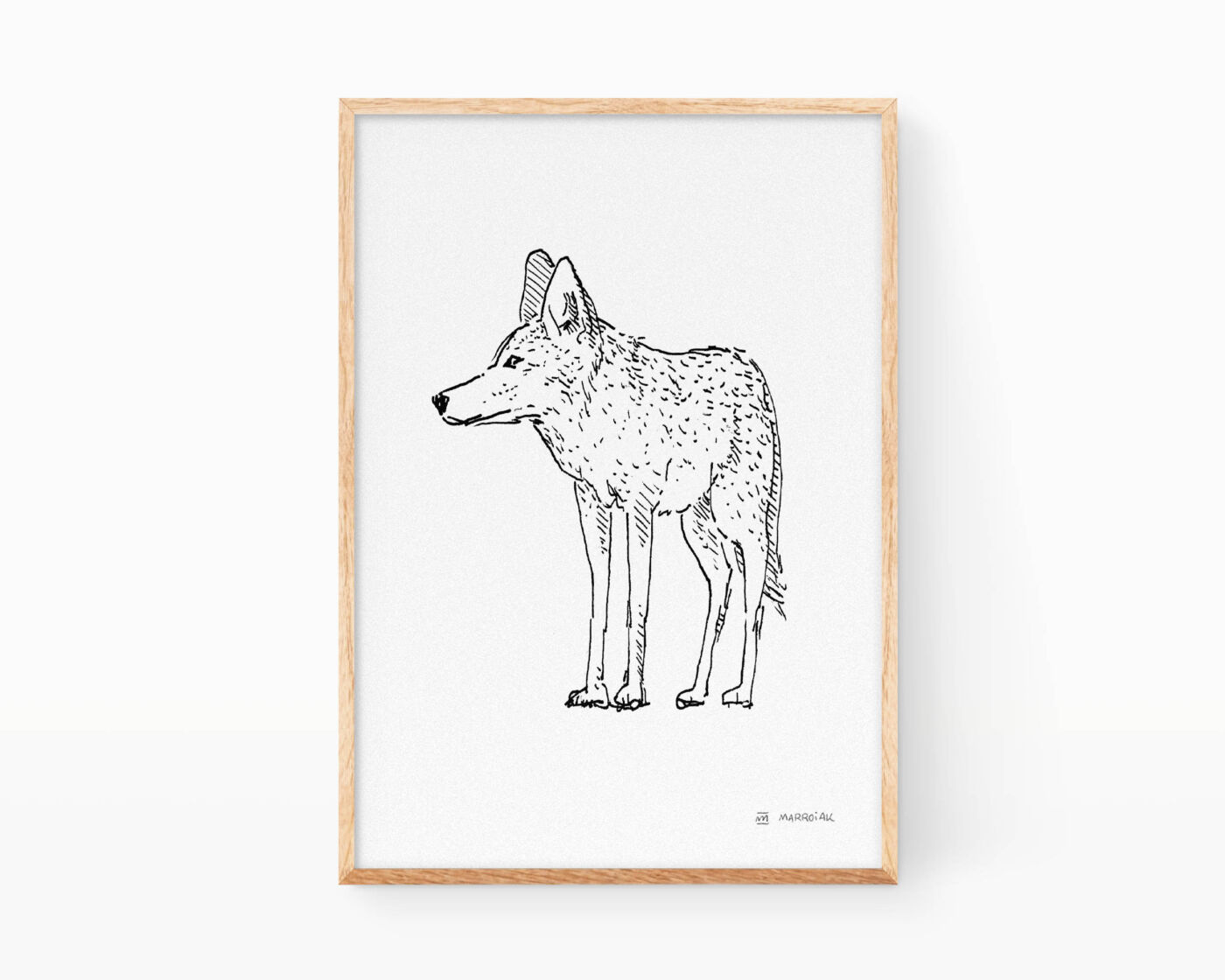 Lámina artesanal firmada con una ilustración de un coyote. Dibujo en blanco y negro realizado con tinta sobre papel.