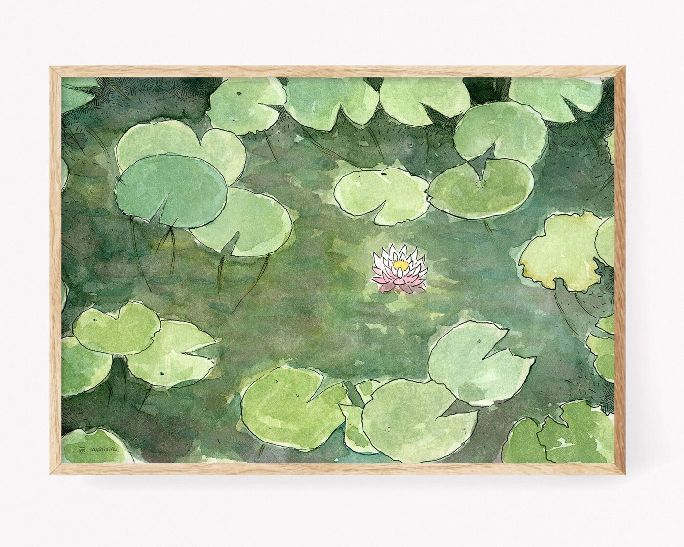 Print artesanal firmada con una ilustración de unos nenúfares del jardín de Lumbini en Nepal.