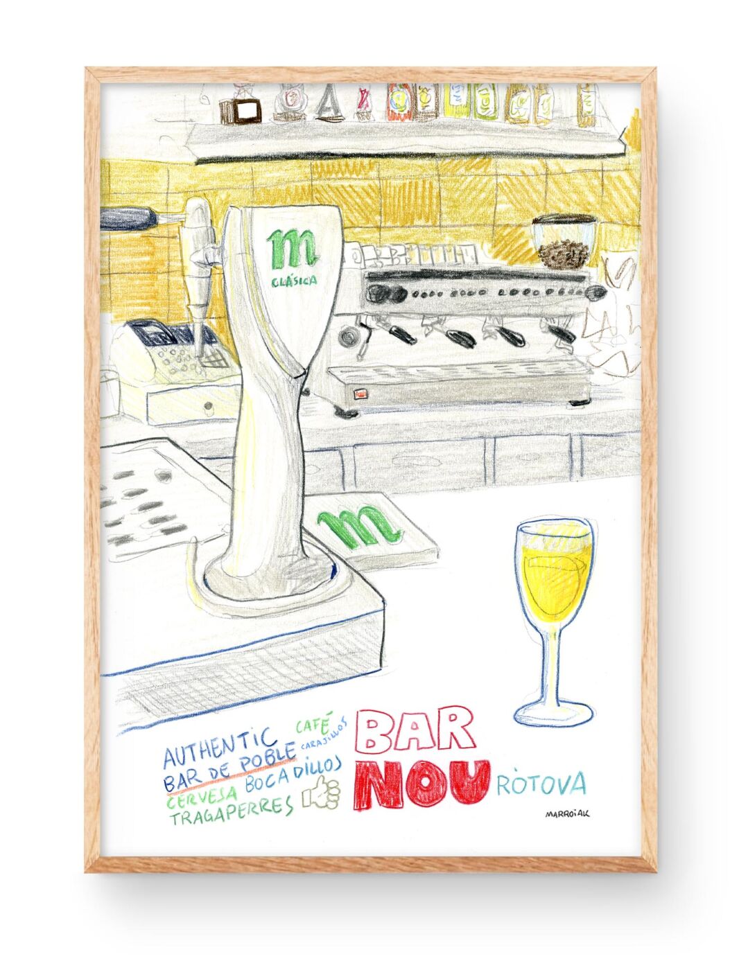 Print firmada con una ilustración del Bar Nou en Ròtova (La Safor, Valencia). Dibujo realizado originalmente con lápices de colores sobre papel.