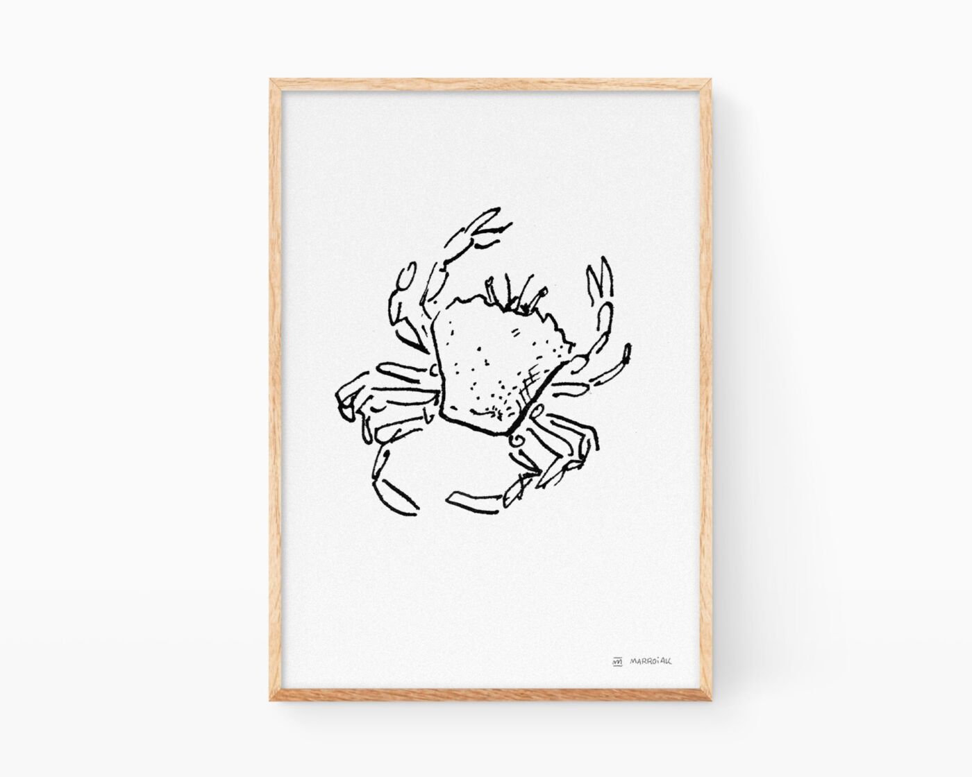 Lámina artesanal firmada con una ilustración de un cangrejo de playa (Carranc en Valenciano). Dibujo en blanco y negro realizado en tinta sobre papel. Print para enmarcar.