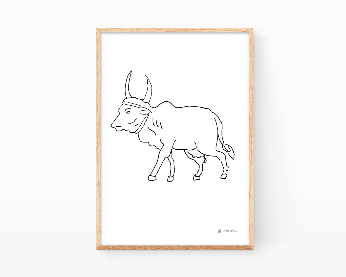 Lámina con una ilustración en blanco y negro de una vaca de la India cuya raza es conocida como Brahman. Dibujo realizado originalmente en tinta y plumilla sobre papel.