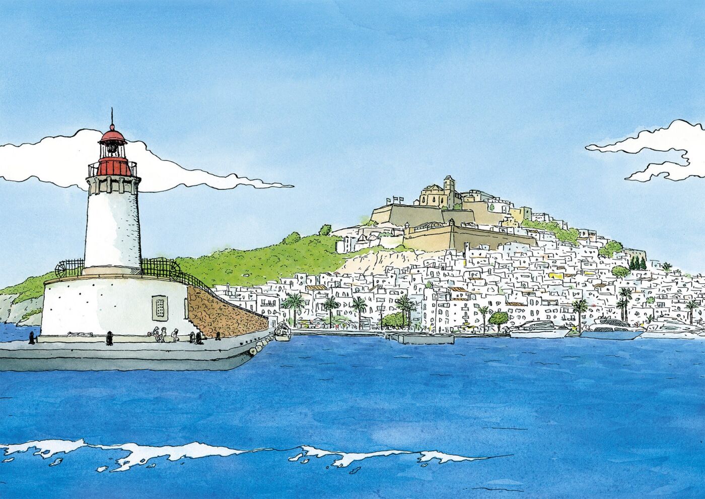 Cuadro estilo ukiyo-e del faro del puerto de la ciudad de Ibiza en el que aparece al fondo el centro histórico de la ciudad así como el barrio de La Marina y la montaña. Apto para decoración mediterránea de casas y apartamentos de playa.