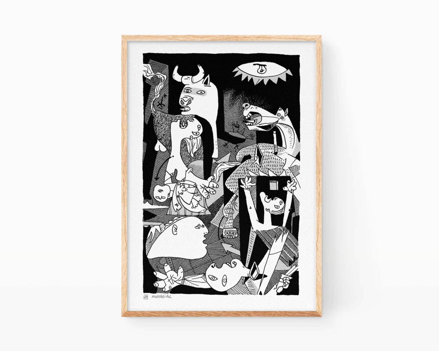 Cuadro decorativo para enmarcar con una ilustración de la obra pictórica El Guernica de Pablo Picasso compuesta por un póster en blanco y negro del genio malagueño impulsor y creador de la pintura de estilo cubista. Se trata de una lámina especialmente indicada para decorar casas y viviendas de estilo contemporáneo, moderno, elegante y minimalista. Es una versión exclusiva de arte de vanguardia disponible para comprar en la tienda online ofrecida como venta directa del artista desde su estudio en Gandia, Valencia. El producto es una giclèe print realizada de manera artesanal y con métodos digitales. Reproducción de dibujos de arte en diferentes tamaños A6 A5 A4 A3 A2 A1. Lámina hecha con papel de calidad museo vendido sin marco.