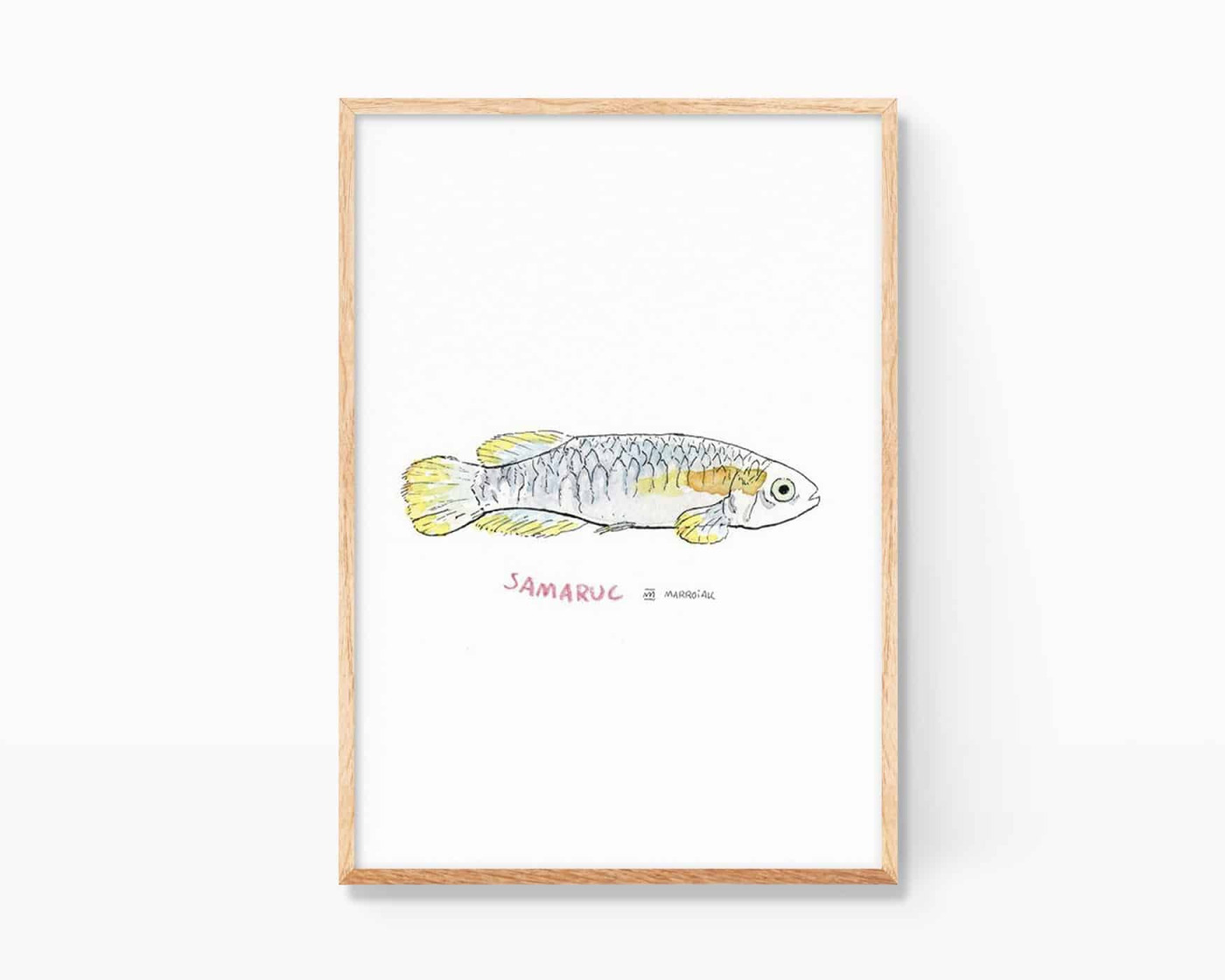 Print para enmarcar con una dibujo en acuarela y tinta sobre papel de un samaruc, un pez endémico de la Comunidad Valenciana y sur de Cataluña en situación crítica debido a la alteración de los entornos naturales.