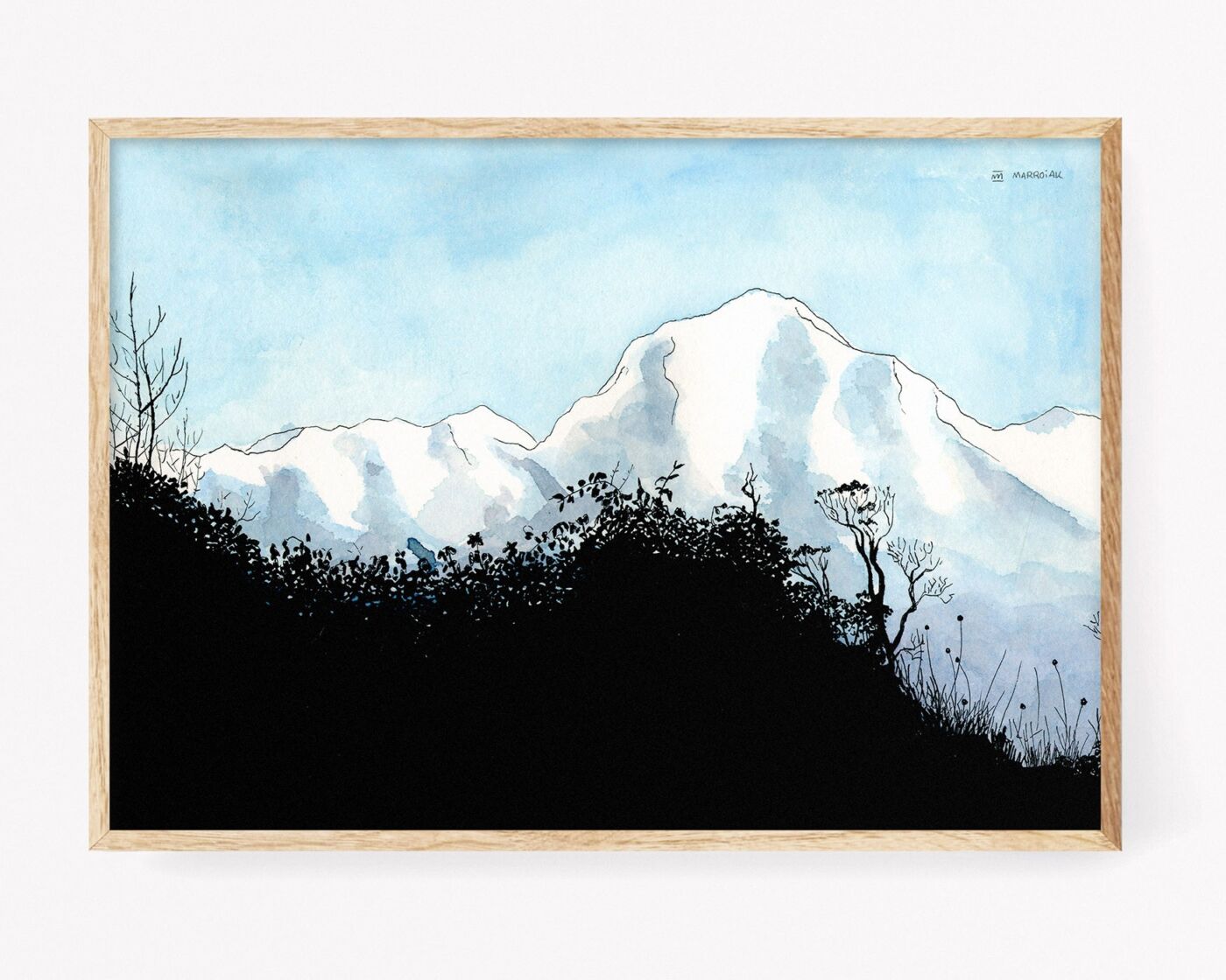 Lámina artesanal firmada con un dibujo del Annapurna (Nepal) visto desde Poon Hill, un pico cercano a la aldea de Ghorepani, que se encuentra en una de las rutas de senderismo que transcurren por el Área de Conservación del Annapurna (Nepal). La ilustración original fue realizada en tinta y acuarela sobre papel para ilustrar el Art Book de Nepal publicado el año 2016.