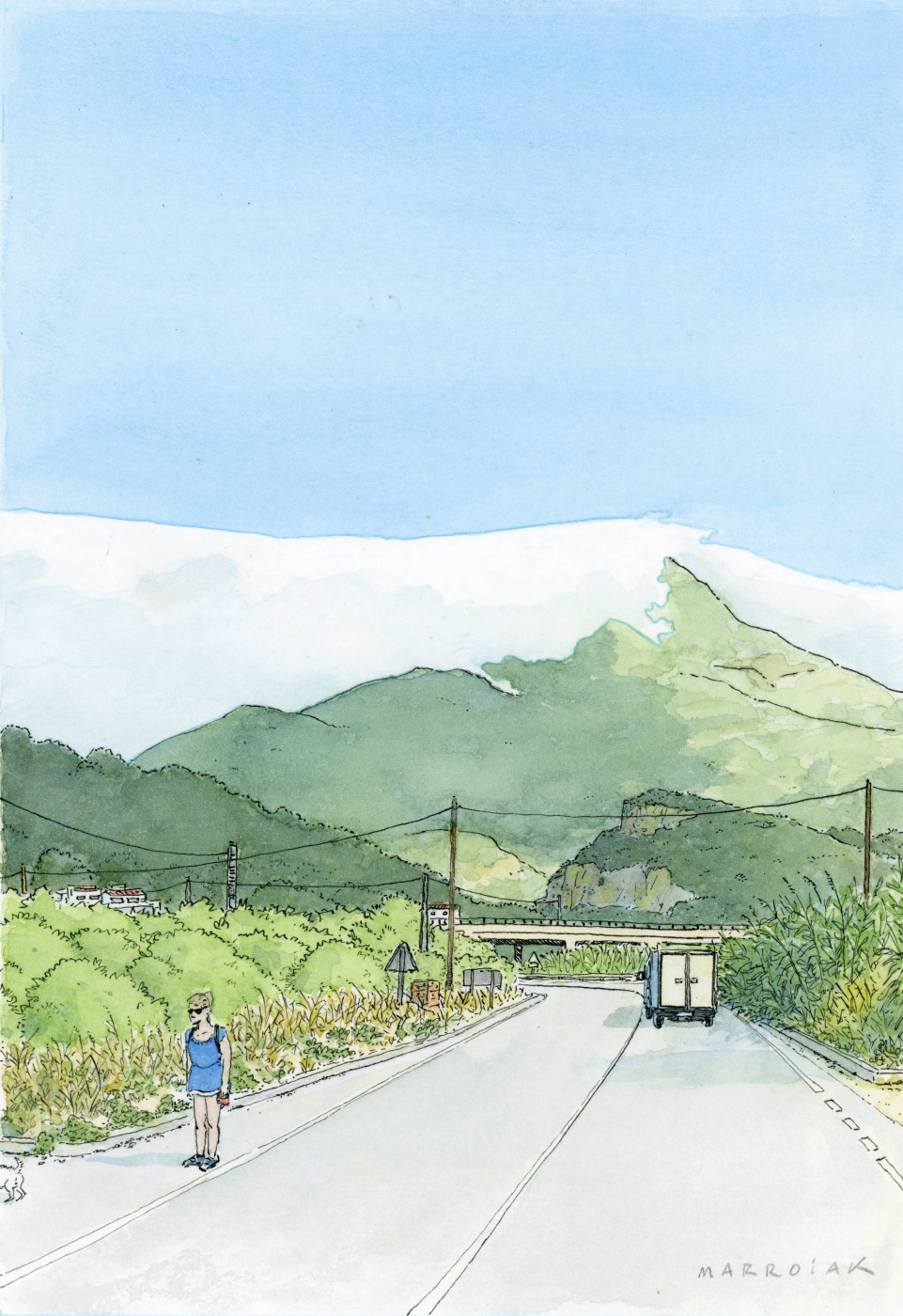 De Gandía a Marxuquera con el Monduber arropado por una nube. A la izquierda el Molló de la Creu. Y una mujer paseando al perro.