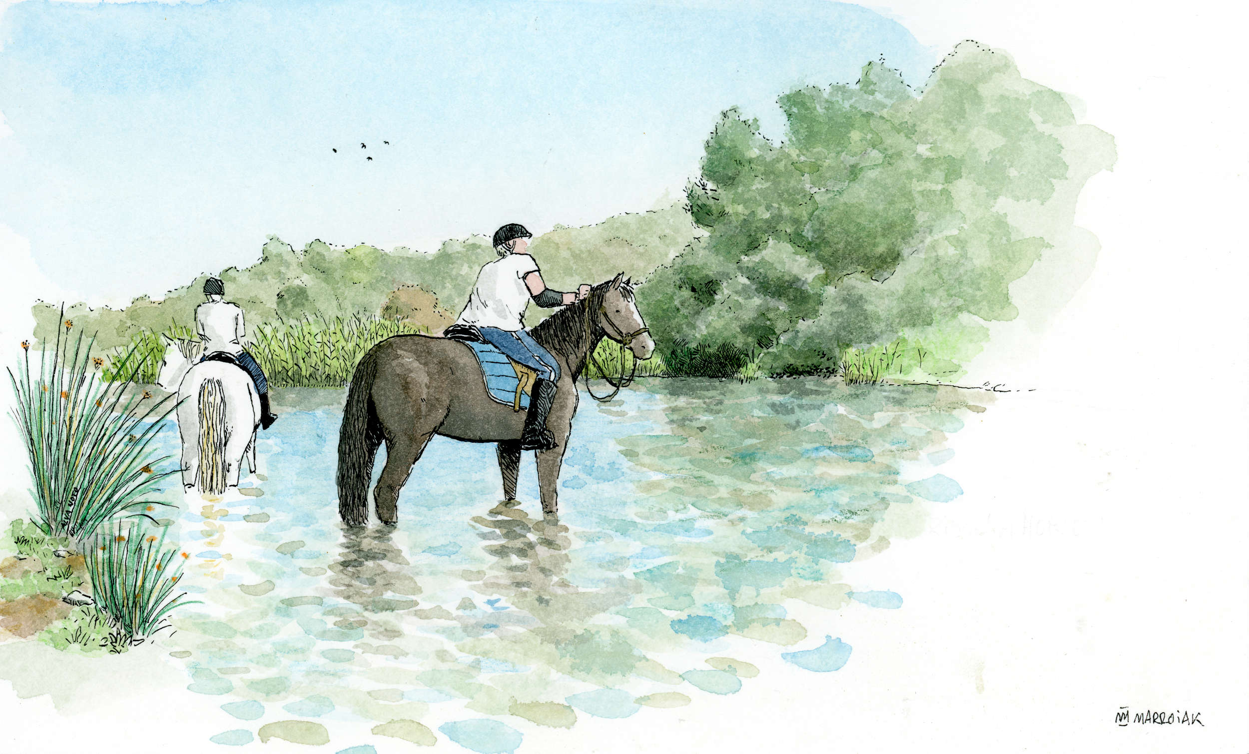 Un dibujo en acuarela y tinta de dos caballos de paseo por la Marjal Pego-Oliva.