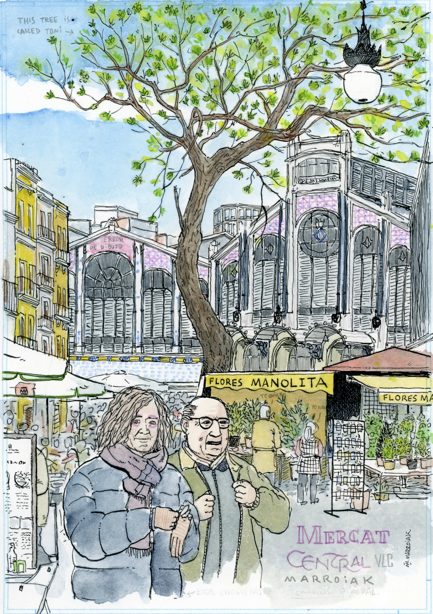 Una acuarela con vistas a la fachada del Mercat Central de Valencia.
