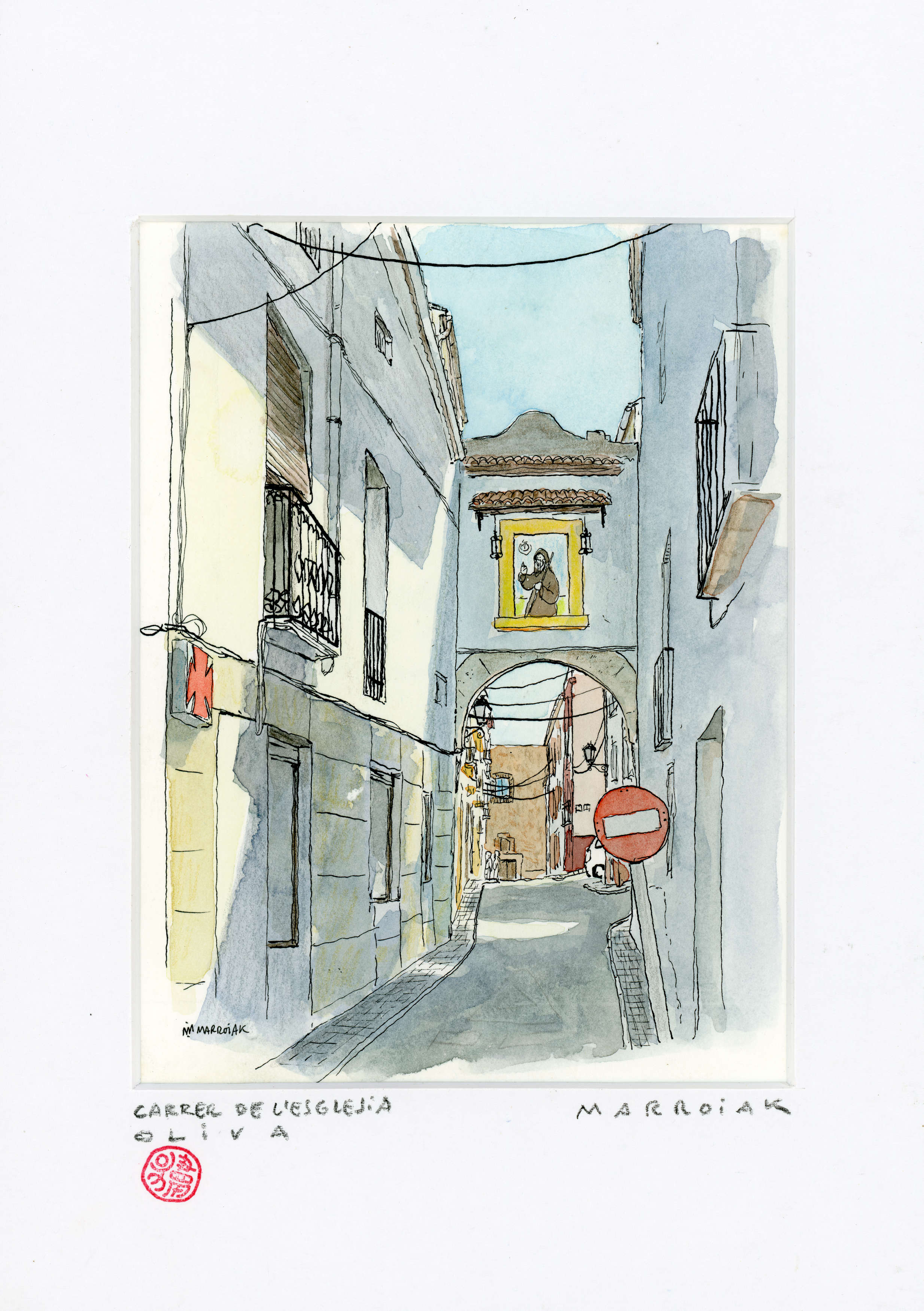 Una acuarela original que apareció en el cuaderno de viaje de Oliva (este). Esta pieza incluye passepartout con el texto que se ve en la imagen.