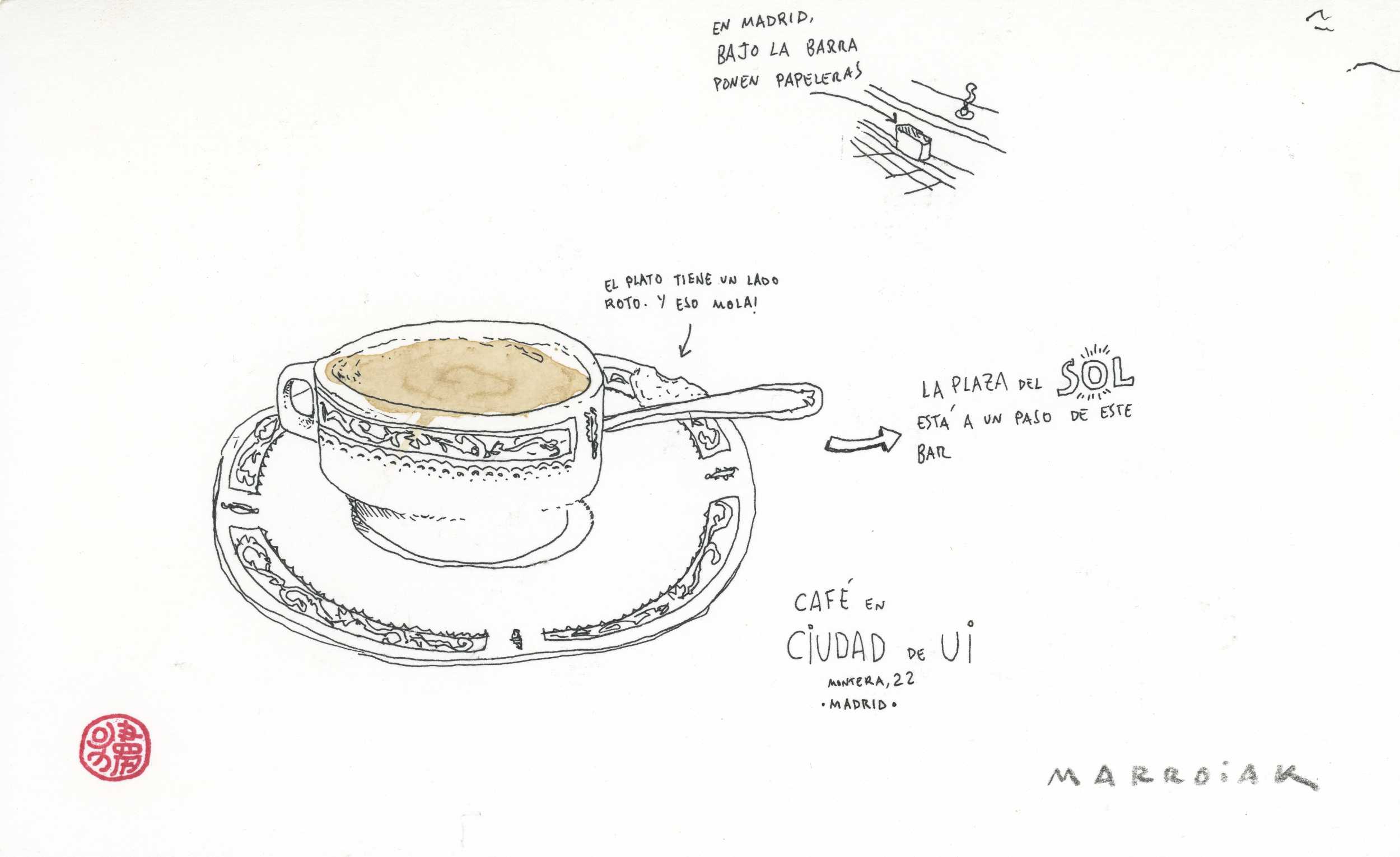 Un boceto original de una taza de café en un bar de Madrid. Realizado allí mismo. Ojo, el tono marrón del boceto es del mismo café que tenía la taza.