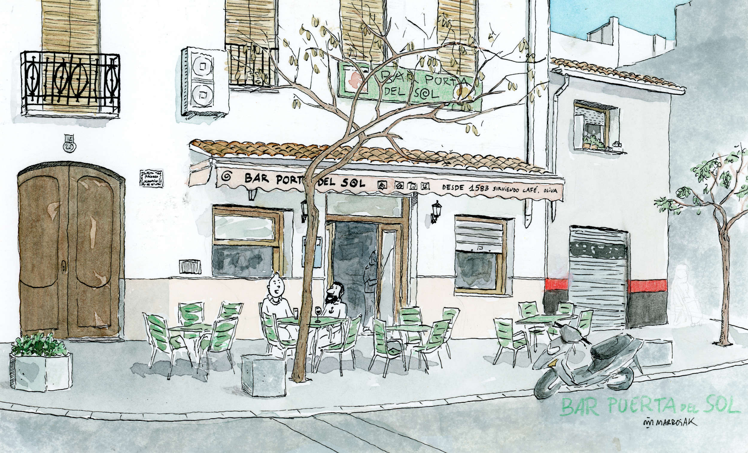 En esta pieza encontrarás a Tintin tomando un agua con gas en el bar La Puerta del Sol en Oliva (el bar existe). Le acompaña el Capitán Haddock.