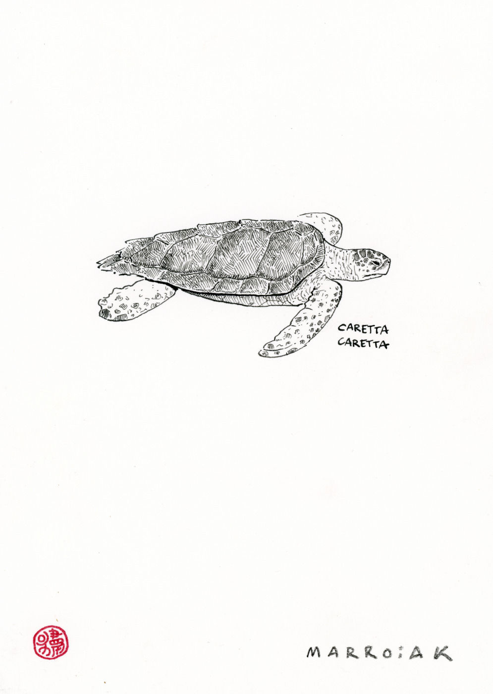 Boceto original de una tortuga boba (Caretta caretta) realizado con tinta sobre papel.