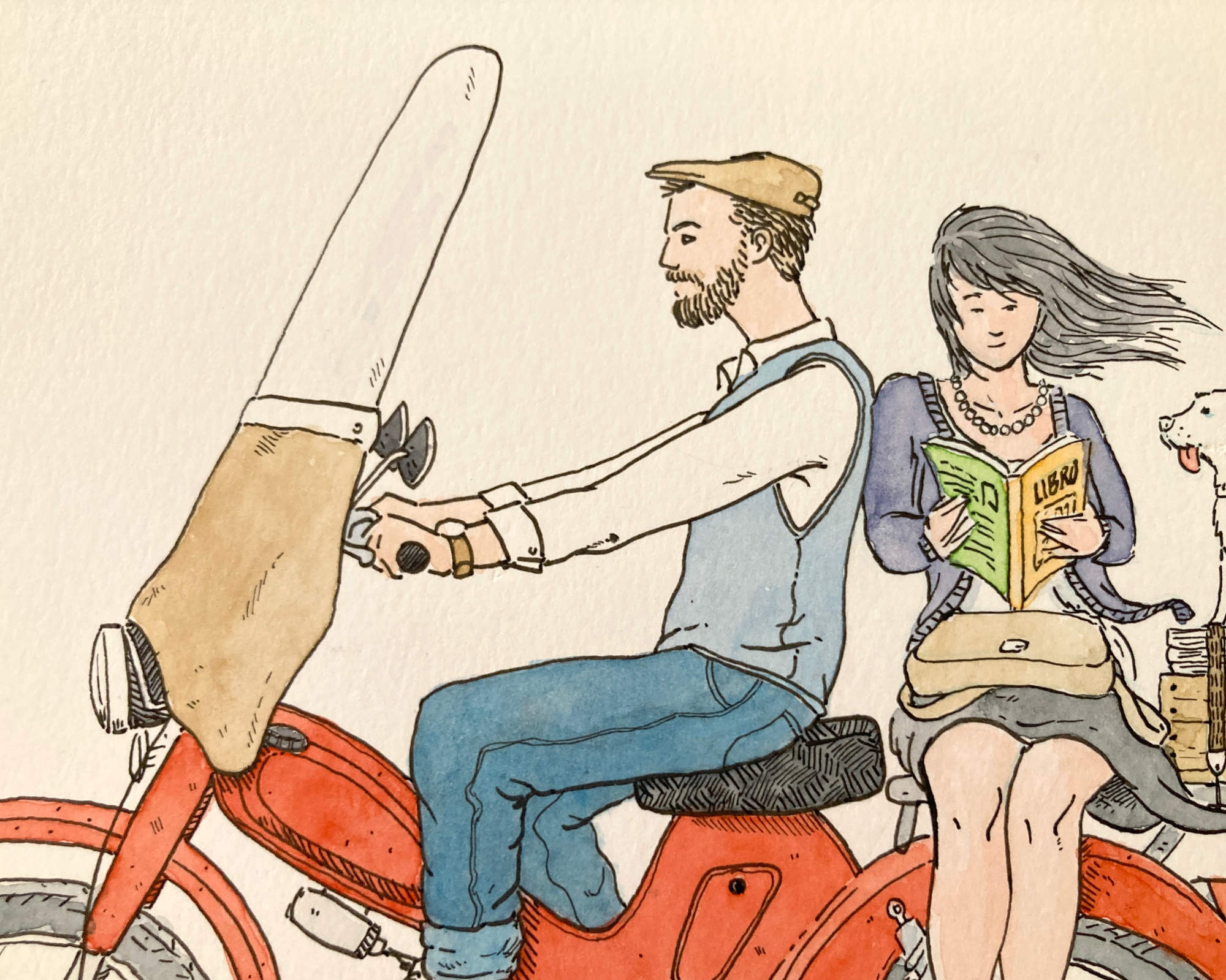 Una imagen que rescata el encanto del Abuelo en Mobylette (ver la obra) y lo traslada a Pareja Joven en Mobylette.